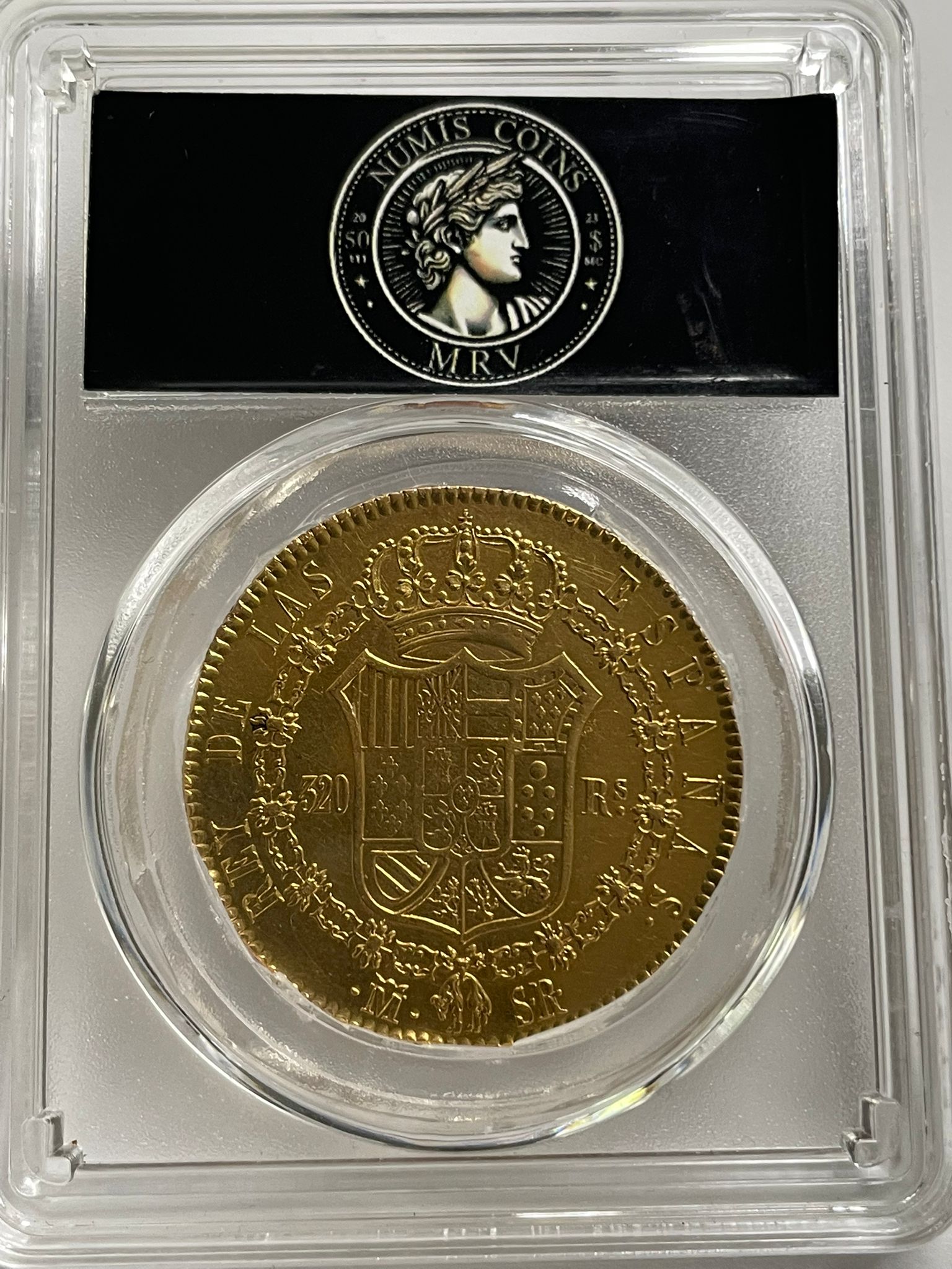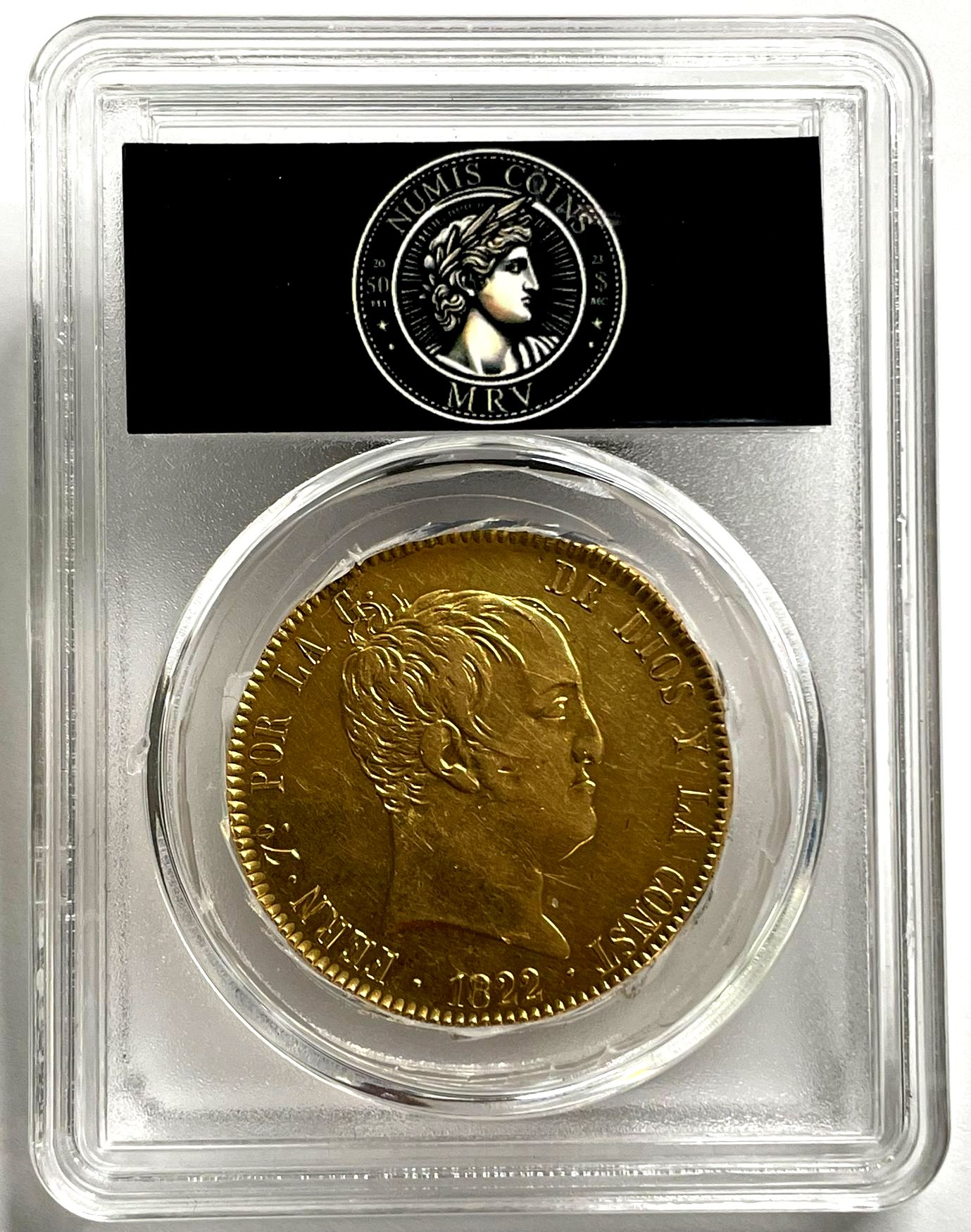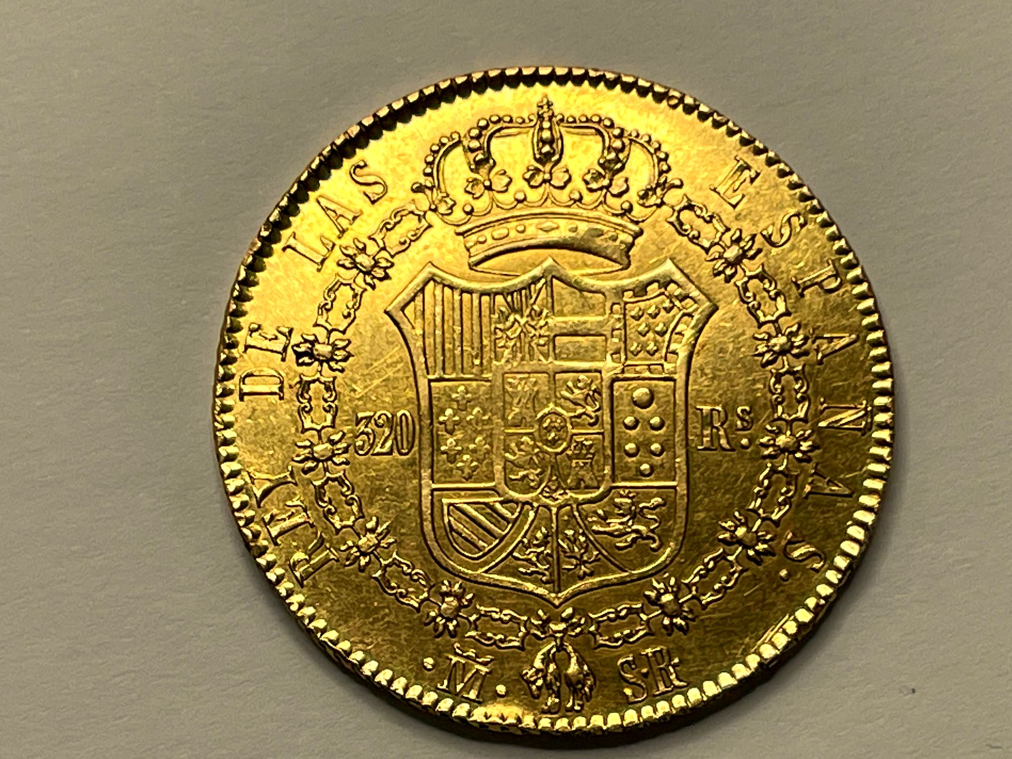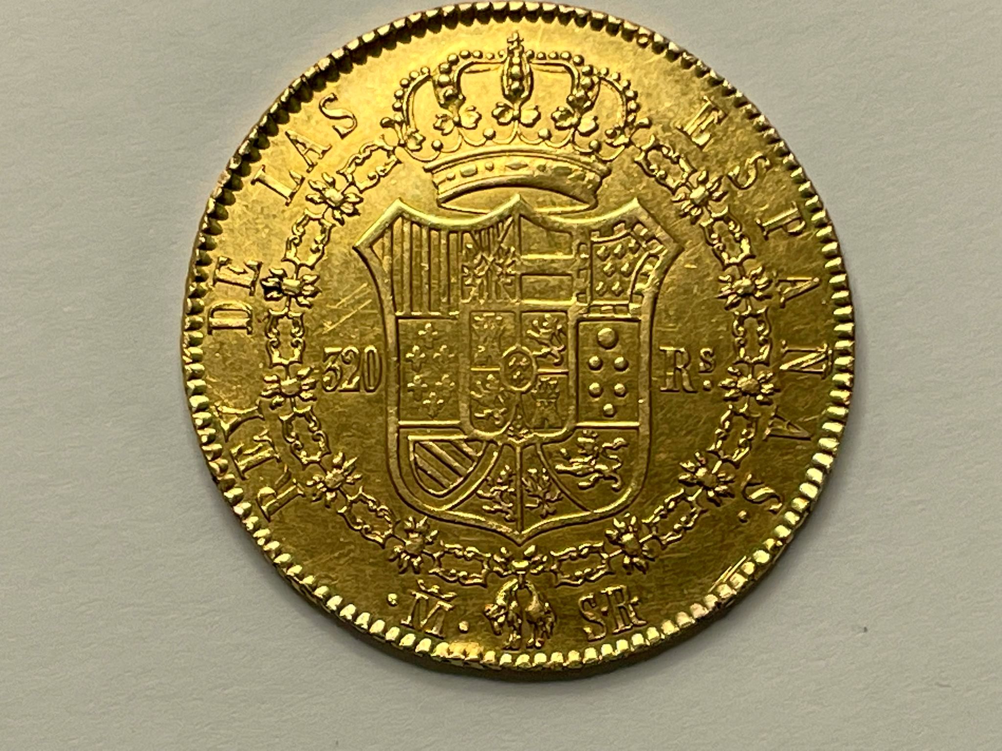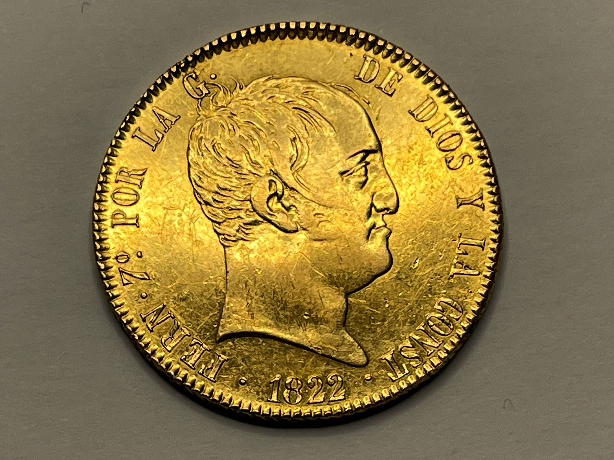 320 Reales 1822 Madrid S.R Fernando VII (AC. 1778) (Cal.Onza 1243). Tipo “cabezón”. Leves rayitas. Atractiva. Muy rara. 27,00 g. MBC+/EBC-.