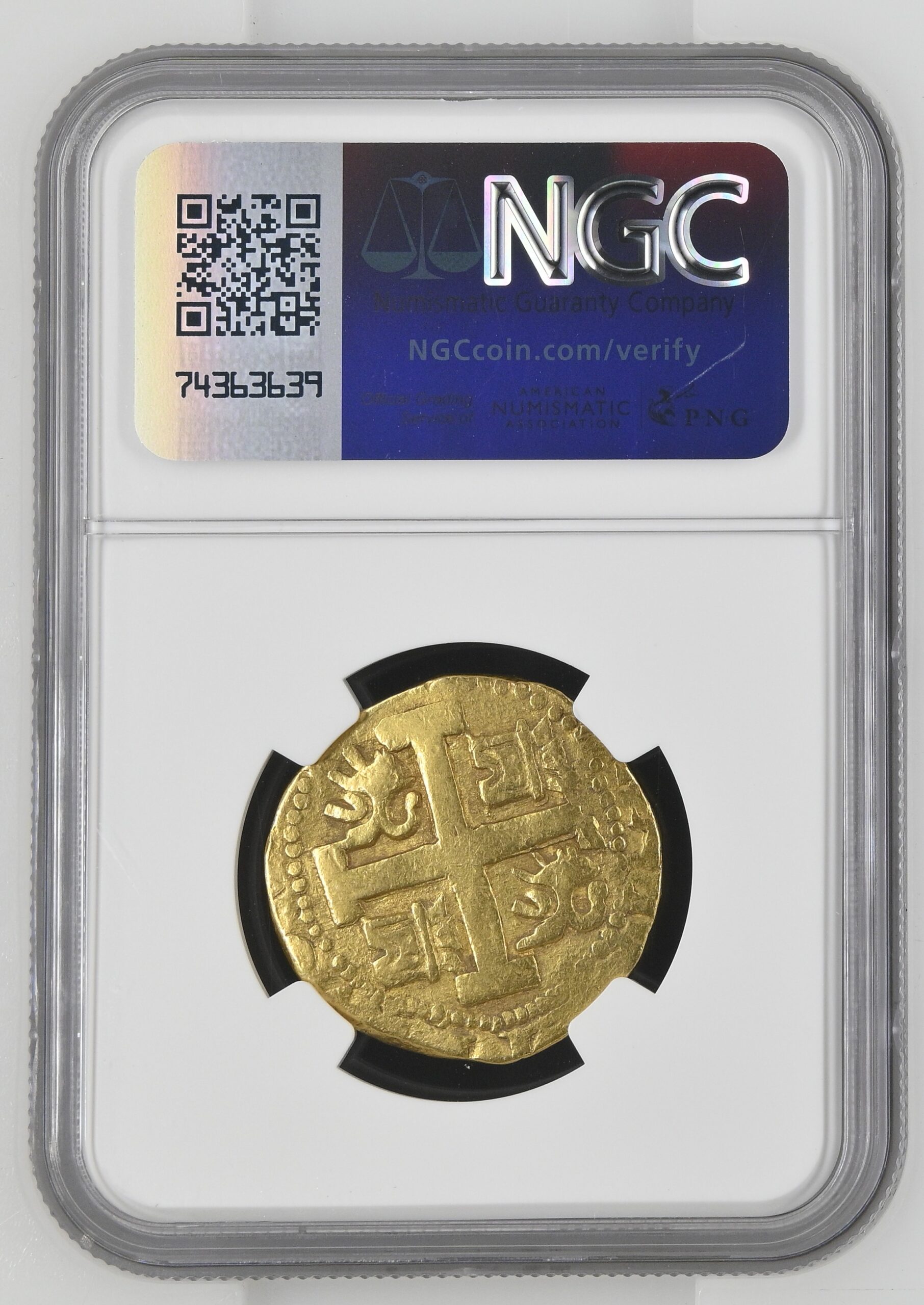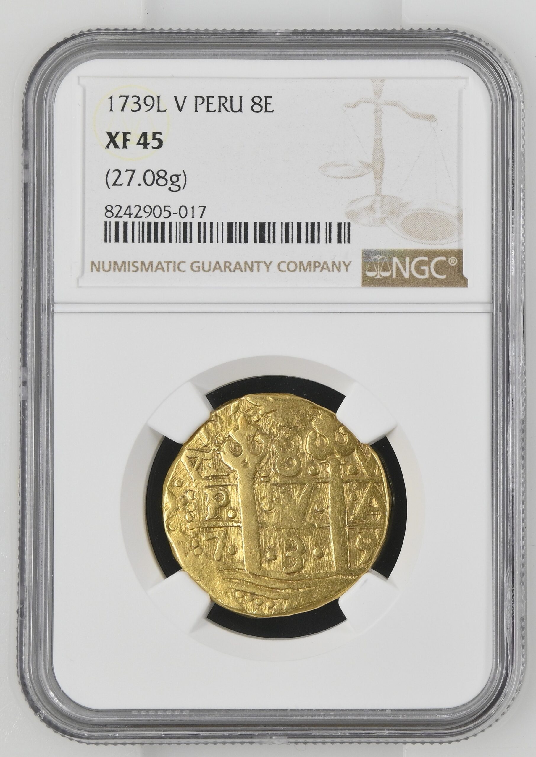 Moneda de oro Philip V Cob de 8 Escudos 1739 LV XF45 NGC, ceca de Lima, KM38.2, Cal-2156, Onza-324 (Rara), Oro Macuqino-324. 27,08 g.  en buen estado, con pátina de oro antiguo. Si bien no es la mejor conservada, esta pieza es una de las seis únicas que actualmente reciben calificaciones perfectas entre ambos servicios de certificación