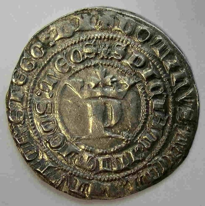 Anv: P coronada con estrella en el extremo derecho de la base,alrededor leyenda . DOMINVS:MICHI:ADIVTOR:ET:EGO:DI+ en el interior SPICIAM:INIMICOS:MEOS