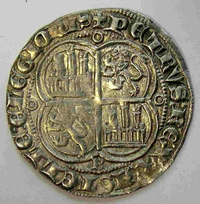 Rev: Cuartelado de castillos y leones rampantes a izquierda dentro de gráfila cuatrilobular, debajo B alrededor leyenda PETRVS:REX:CASTELLE:E:LEGIONIS.