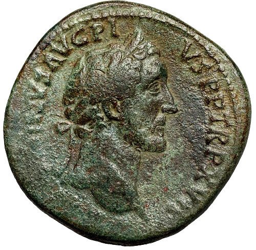 Roma. Anverso: Busto del emperador con corona de laurel, mirando a la derecha, alrededor de la leyenda ANTONINVS AVG PIVS PP TR P XV. Reverso: Salus de pie hacia la izquierda, sosteniendo un cetro largo y una patera de la cual alimenta a una serpiente. En el segmento, las letras SC, alrededor de la leyenda SALVS AVG COS IIII. Bronce, diámetro 32,5 mm, peso 22,86 g.